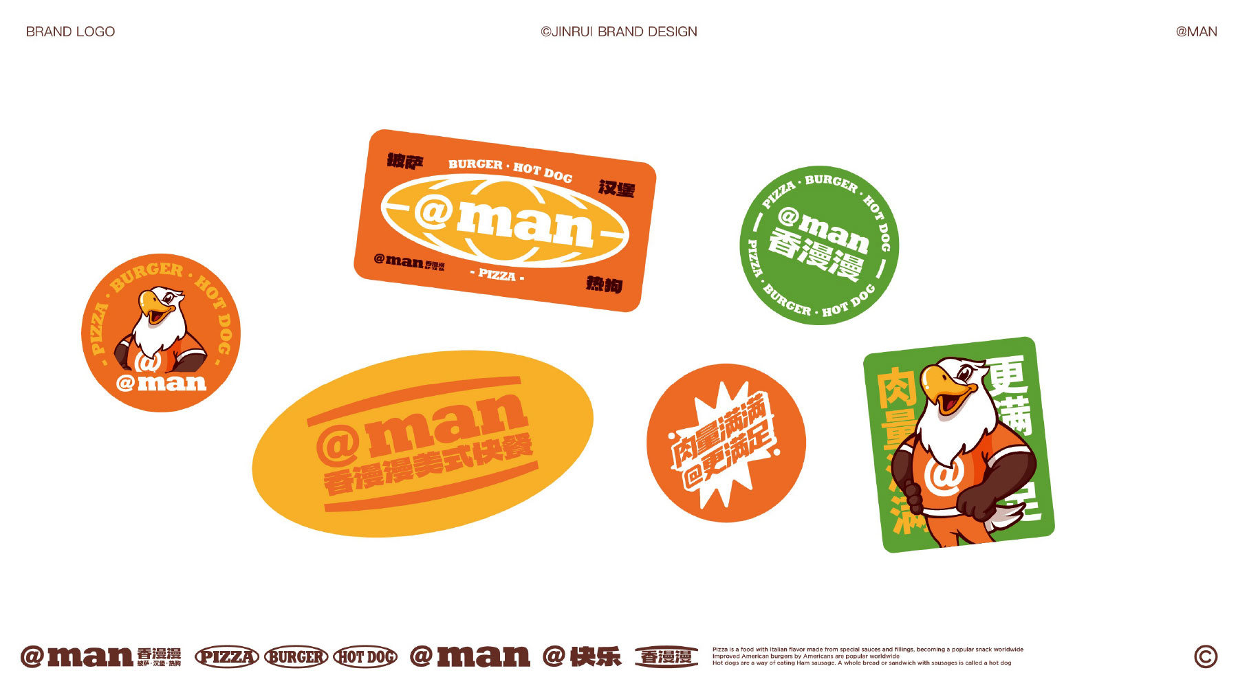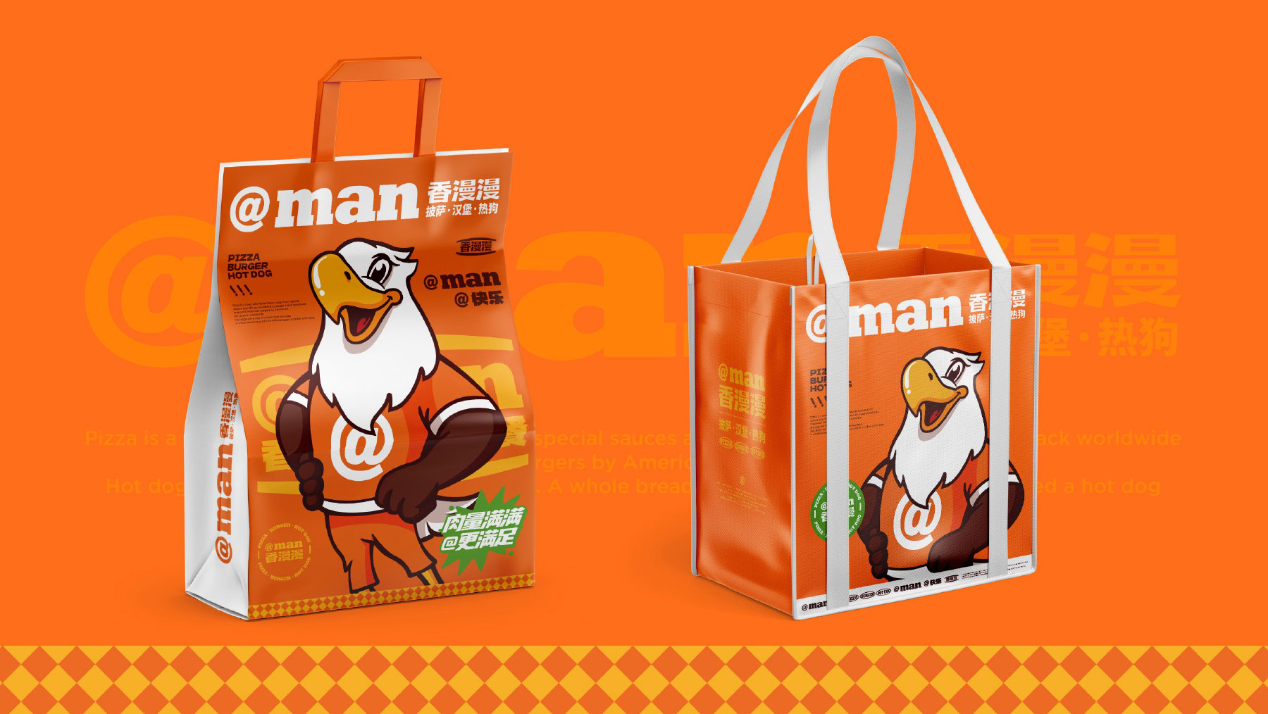今睿为香漫漫品牌进行了品牌英文命名,@man,以及@man@快乐的品牌定位,以强烈的IP形象设计,美式风格的形象打造出了香漫漫的美式快餐印象风格。