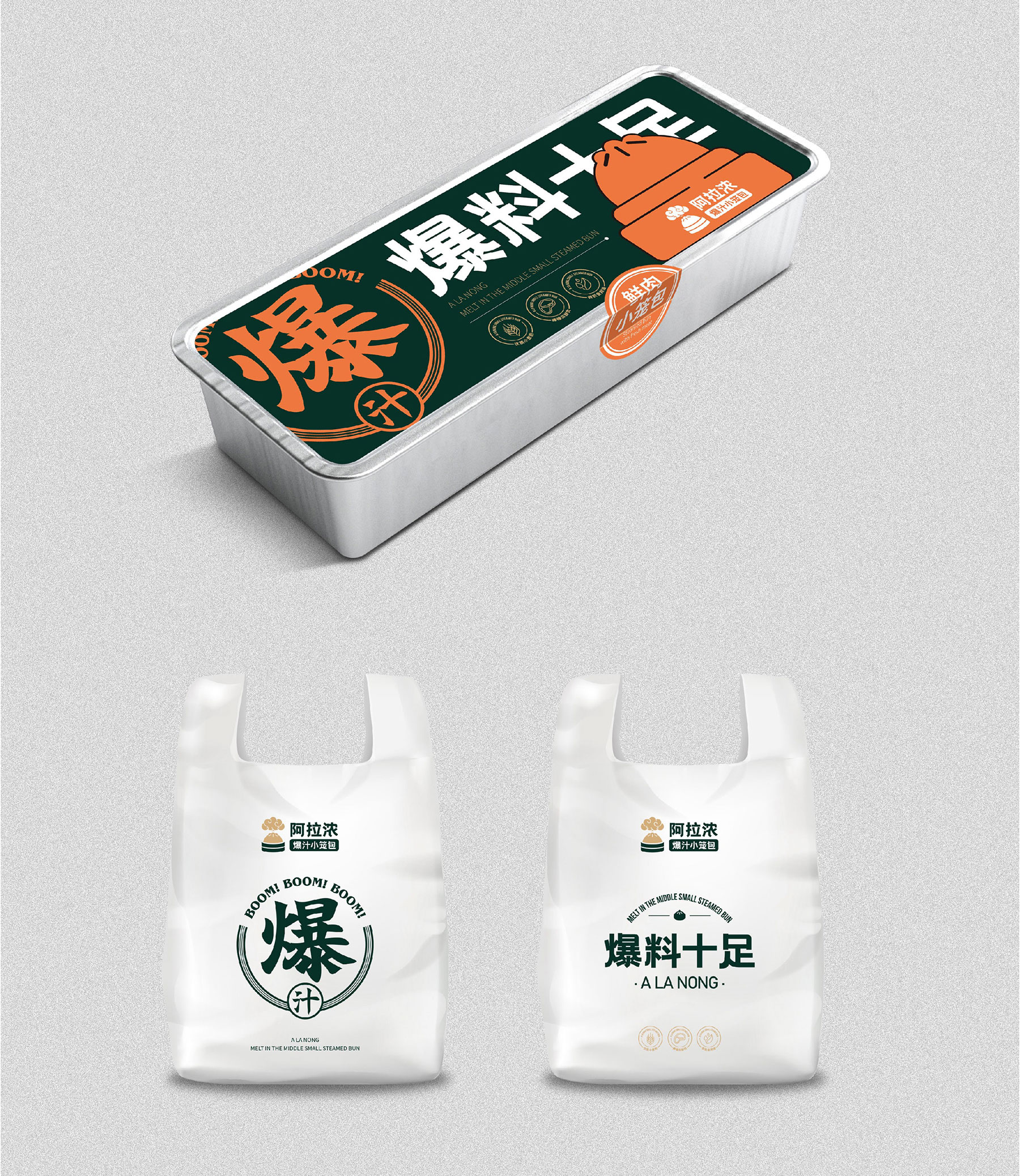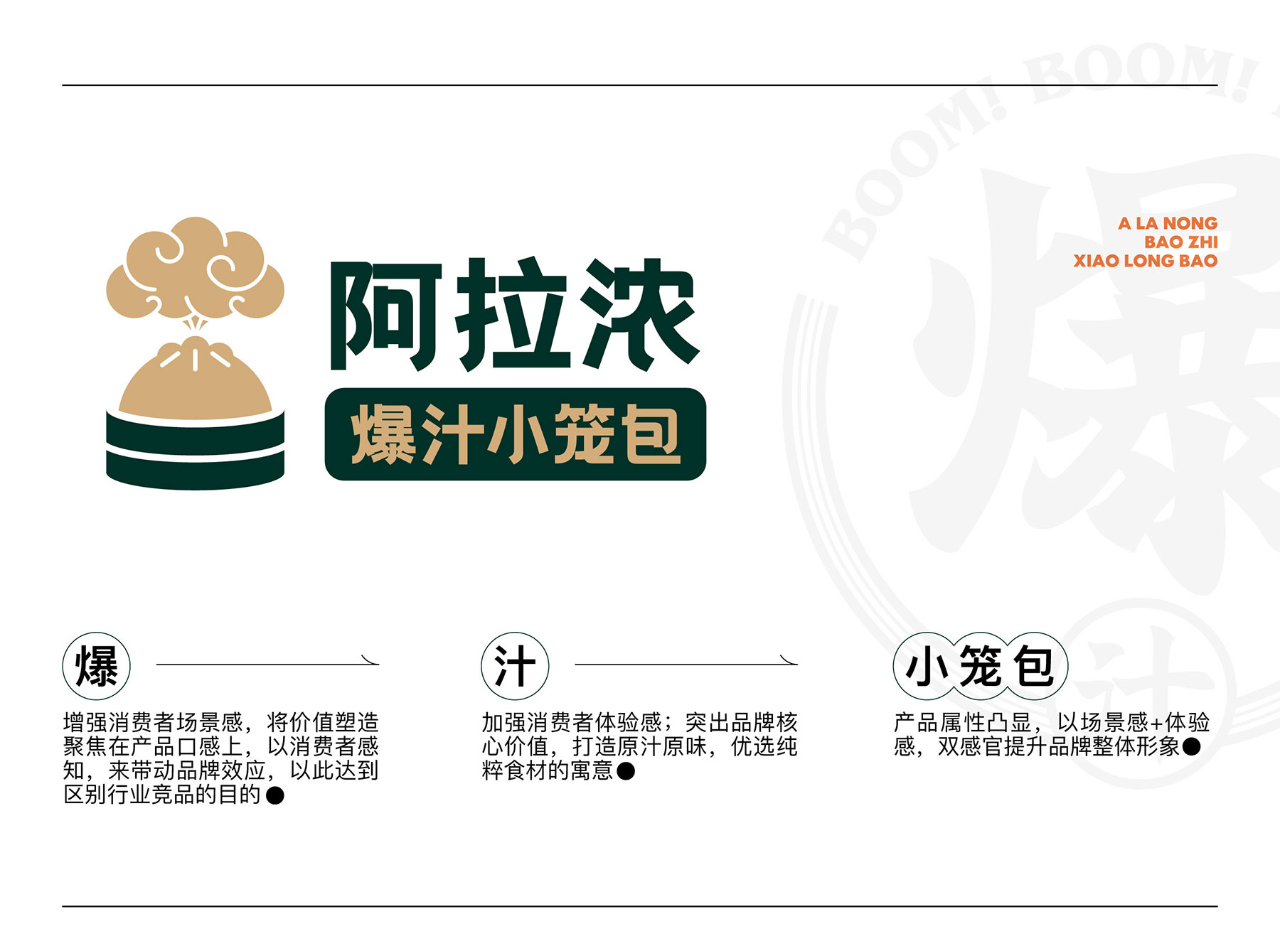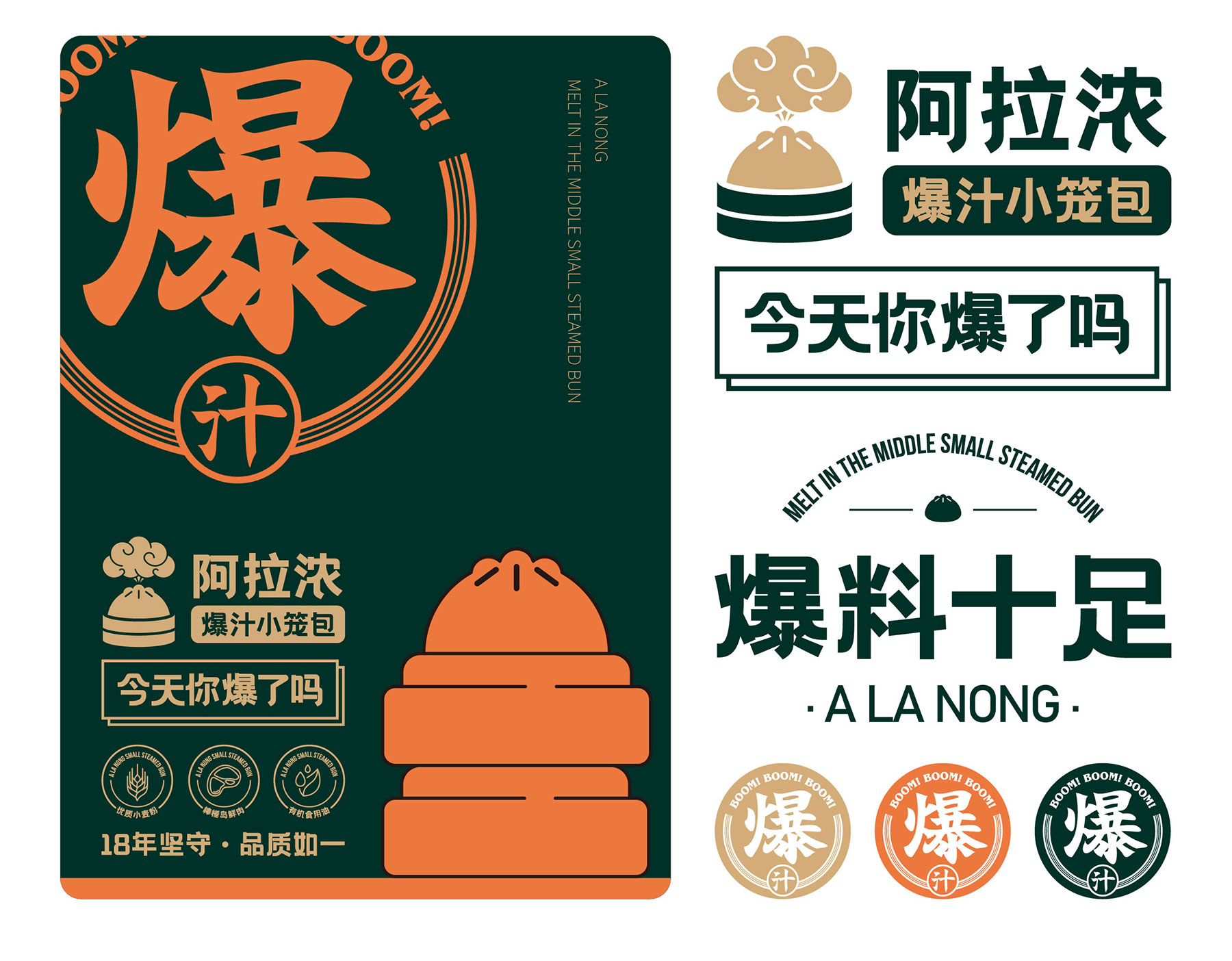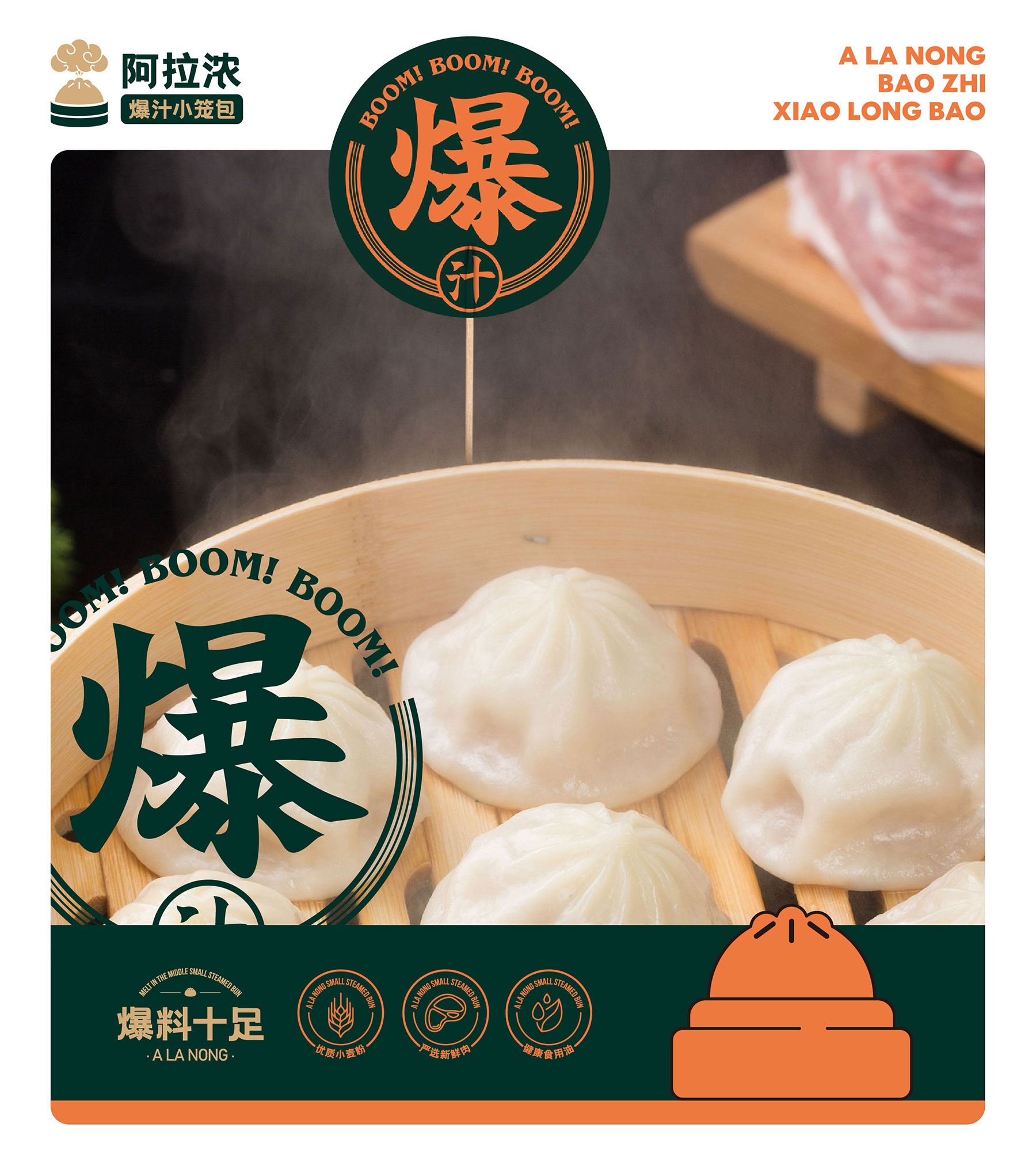 阿拉浓食品(大连)有限公司成立于2019年11月04日,阿拉浓,深耕餐饮行业,18载匠意传承,专注小笼包产品研发与制作;紧跟当代人的健康饮食理念,深度贯彻“优选健康食材”的品牌主张,品质如一;2022年,革新餐饮大众品牌,引创流量爆款打造理念,满足消费者多元化口味需求;坚守创新和品质的核心价值,专注国民品牌的打造,开创餐饮新时尚! 2022年,今睿针对打造爆款品牌“阿拉浓爆汁小笼包”,并进行全案VIS规划设计。
