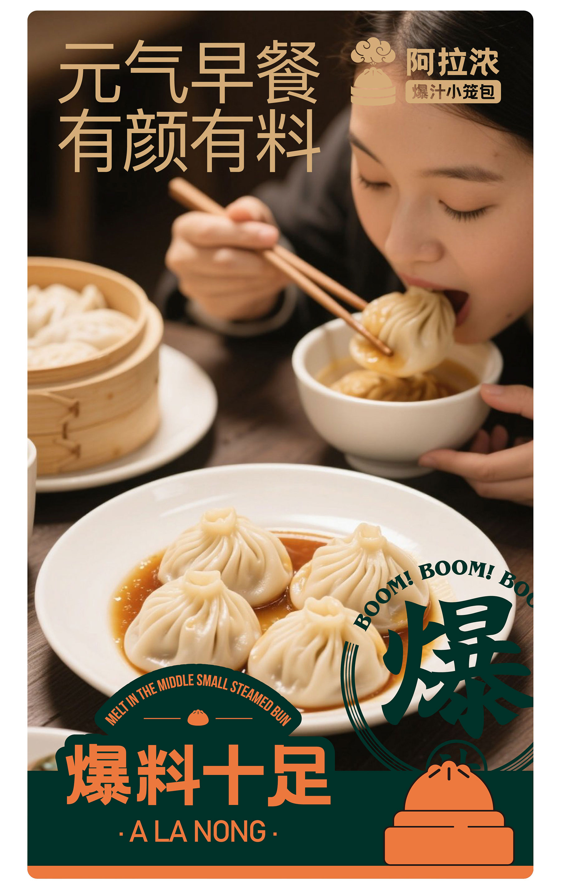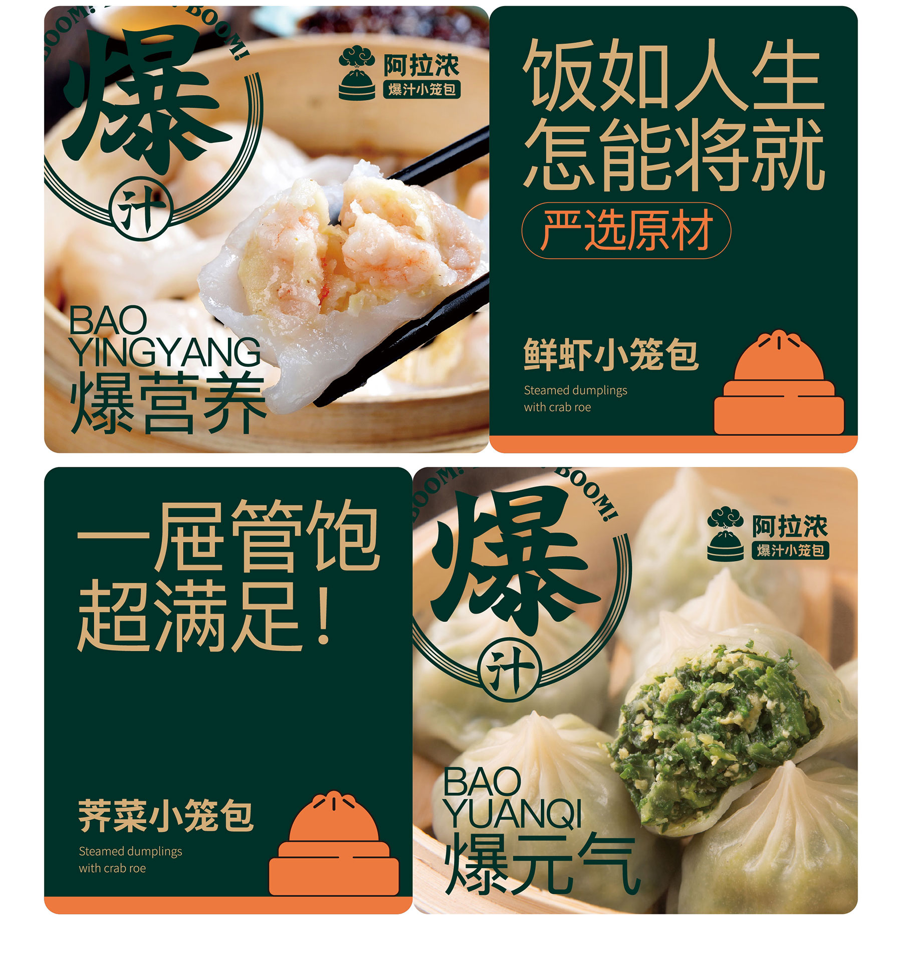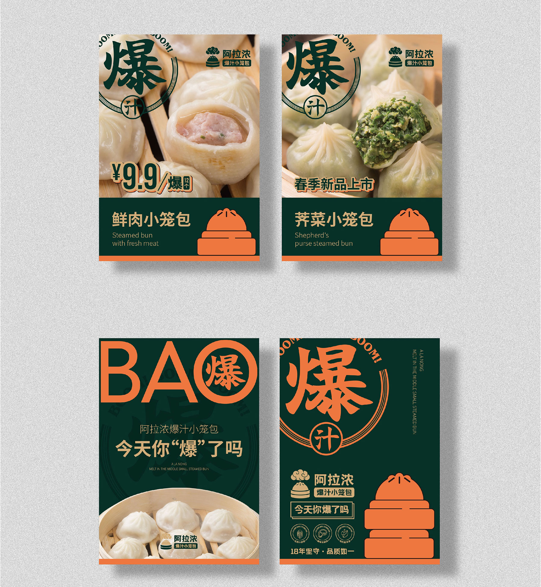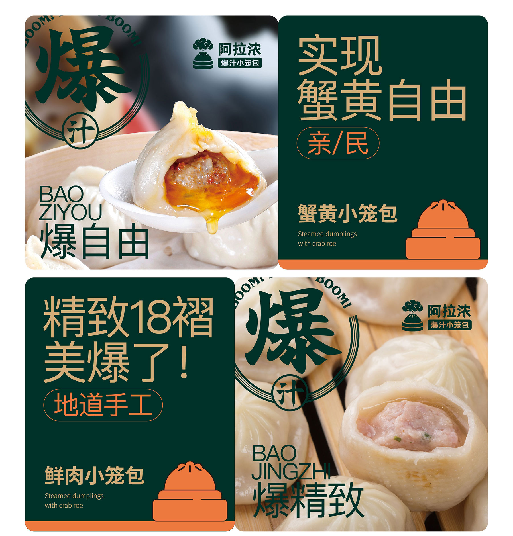 阿拉浓食品(大连)有限公司成立于2019年11月04日,阿拉浓,深耕餐饮行业,18载匠意传承,专注小笼包产品研发与制作;紧跟当代人的健康饮食理念,深度贯彻“优选健康食材”的品牌主张,品质如一;2022年,革新餐饮大众品牌,引创流量爆款打造理念,满足消费者多元化口味需求;坚守创新和品质的核心价值,专注国民品牌的打造,开创餐饮新时尚! 2022年,今睿针对打造爆款品牌“阿拉浓爆汁小笼包”,并进行全案VIS规划设计。