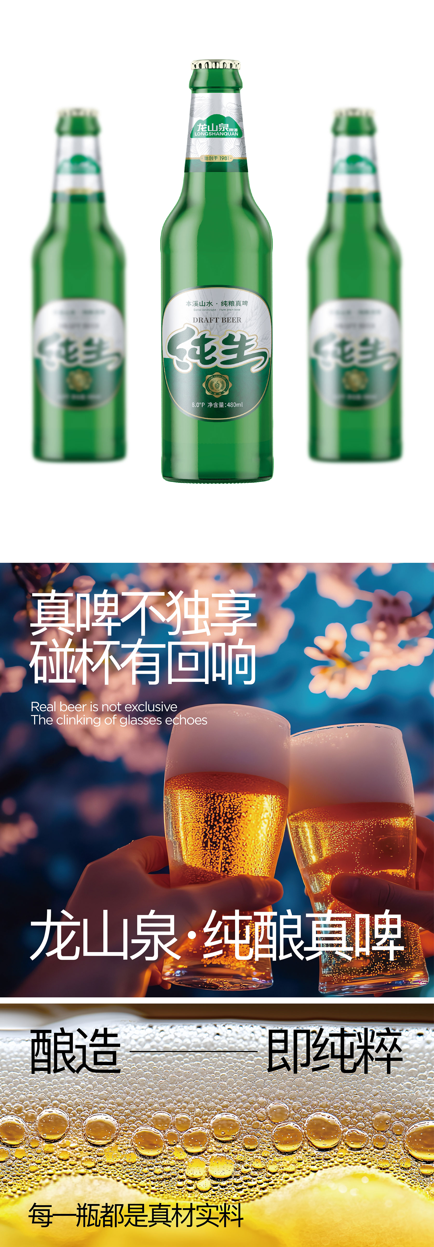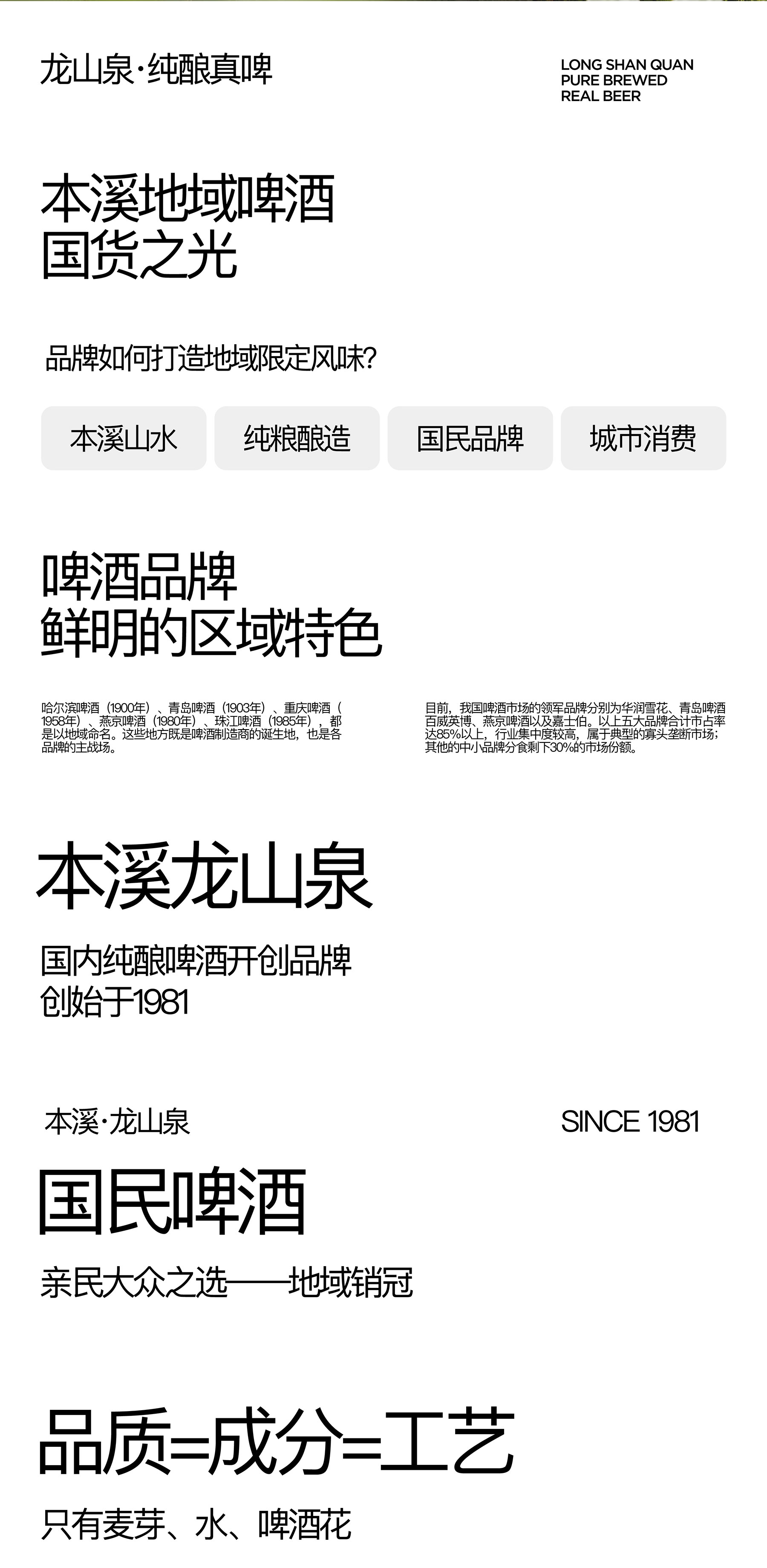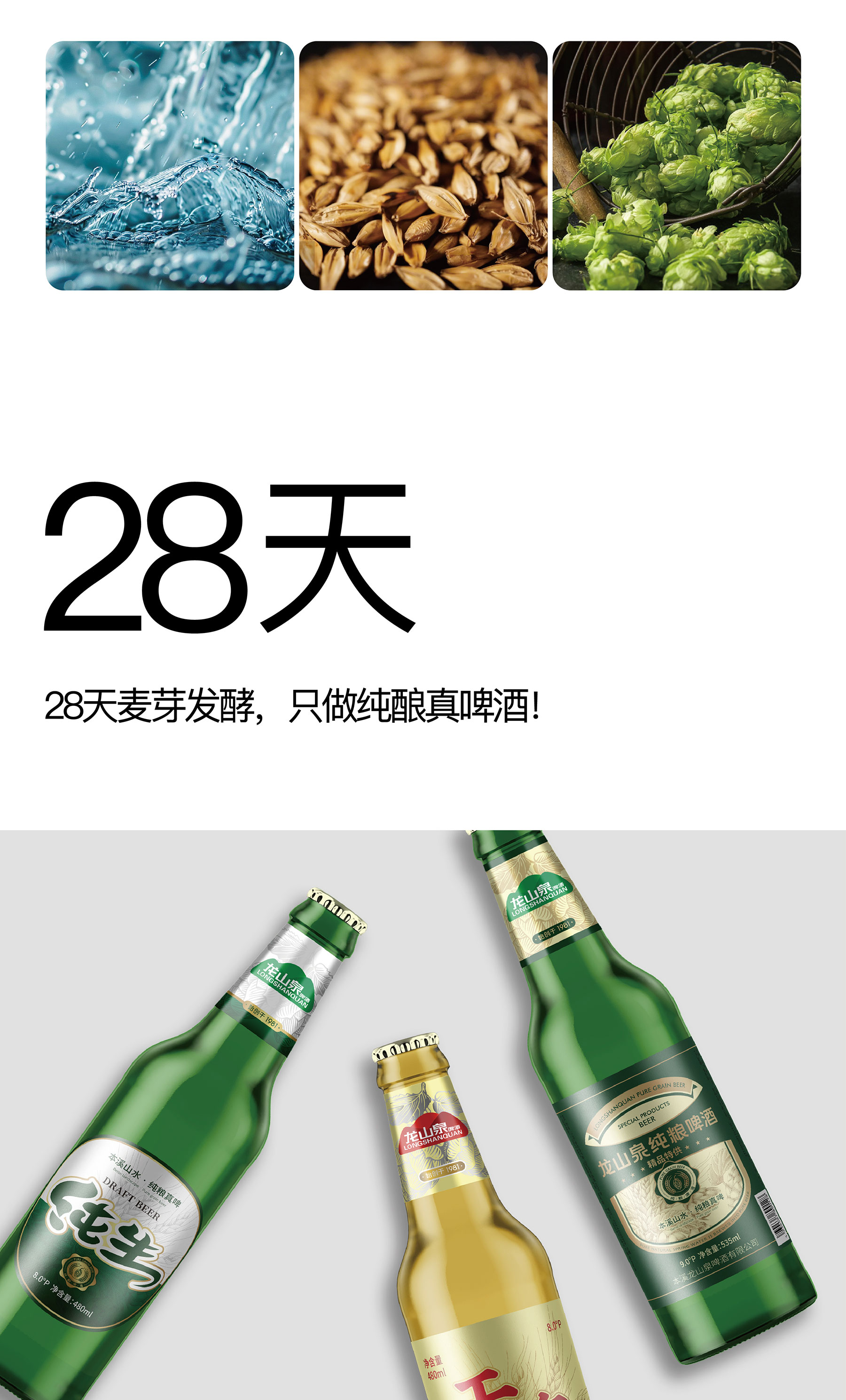 202年今睿实地探访本溪龙山泉啤酒基地,与董事长及团队成员进行深度沟通,并参观了啤酒生产车间,走访当地消费者,对占领本溪当地市场份额绝对遥遥领先的龙山泉有了深入的了解,对龙山泉一直以后秉承的匠心酿酒工艺,品质麦芽及啤酒花产品,没有任何添加的生产流程,得到了充分的理解和敬佩,是国产啤酒的奇迹,也是中国啤酒的价值所在,今睿策划设计,打造龙山泉品牌形象与新产品的包装规划与设计。